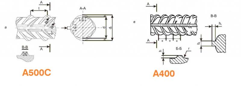 • У А400 профиль обычно кольцевой или крестообразный, у А500С — серповидный, обеспечивающий более равномерное распределение напряжений по длине стержня.